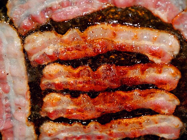 베이컨은 가공육으로 제조공정에서 설탕이나 기타 당분이 첨가되어 프라이팬이나 오븐 등에서 고온 조리 시에 당독소 생성이 증가하게 됩니다.